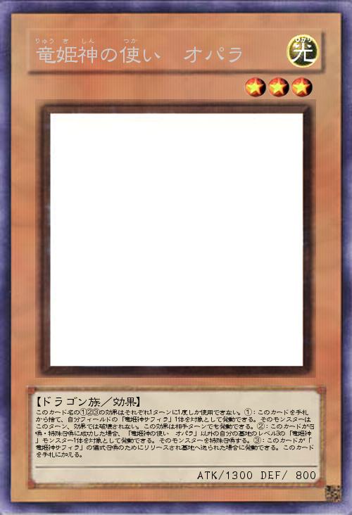 | このカード名の①②③の効果はそれぞれ1ターンに1度しか使用できない。①:このカードを手札から捨て、自分フィールドの「竜姫神サフィラ」1体を対象として発動できる。そのモンスターはこのターン、効果では破壊されない。この効果は相手ターンでも発動できる。②:このカードが召喚・特殊召喚に成功した場合、「竜姫神の使い オパラ」以外の自分の墓地のレベル3の「竜姫神」モンスター1体を対象として発動できる。そのモンスターを特殊召喚する。③:このカードが「竜姫神サフィラ」の儀式召喚のためにリリースされ墓地へ送られた場合に発動できる。このカードを手札に加える。 | |||