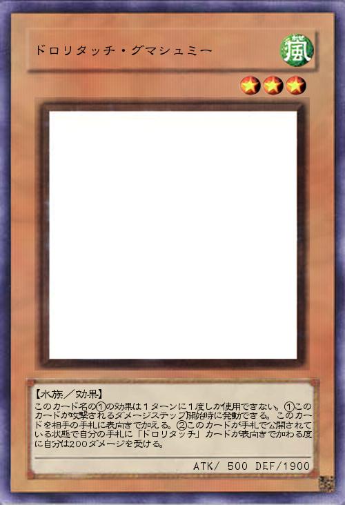 | このカード名の①の効果は1ターンに1度しか使用できない。①このカードが攻撃されるダメージステップ開始時に発動できる。このカードを相手の手札に表向きで加える。②このカードが手札で公開されている状態で自分の手札に「ドロリタッチ」カードが表向きで加わる度に自分は200ダメージを受ける。 | |||