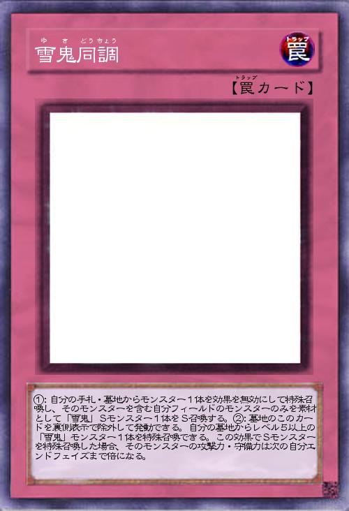 | ①:自分の手札・墓地からモンスター1体を効果を無効にして特殊召喚し、そのモンスターを含む自分フィールドのモンスターのみを素材として「雪鬼」Sモンスター1体をS召喚する。②:墓地のこのカードを裏側表示で除外して発動できる。自分の墓地からレベル5以上の「雪鬼」モンスター1体を特殊召喚できる。この効果でSモンスターを特殊召喚した場合、そのモンスターの攻撃力・守備力は次の自分エンドフェイズまで倍になる。 | |||