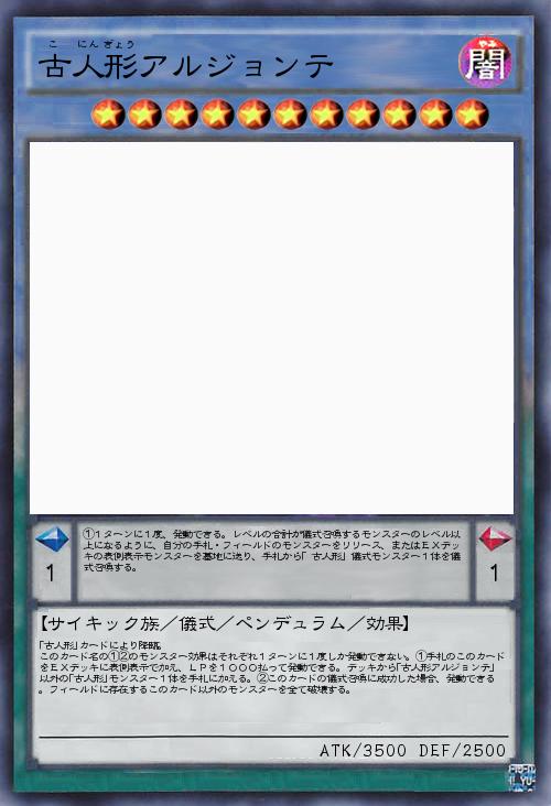 | 「古人形」カードにより降臨。 このカード名の①②のモンスター効果はそれぞれ1ターンに1度しか発動できない。①手札のこのカードをEXデッキに表側表示で加え、LPを1000払って発動できる。デッキから「古人形アルジョンテ」以外の「古人形」モンスター1体を手札に加える。②このカードの儀式召喚に成功した場合、発動できる。フィールドに存在するこのカード以外のモンスターを全て破壊する。 | |||