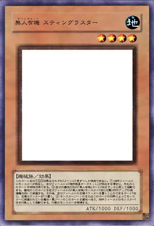 | このカード名の①②③効果はそれぞれ1ターンに1度ずつしか使用できない。①:相手フィールドにモンスターが存在し、自分フィールドに「機然惑星オーガネット」が存在する場合に、手札のこのカードを特殊召喚できる。②:自分の墓地の他の「無人有機」カード2枚をデッキに戻して発動できる。墓地のこのカードを自分フィールドの「無人有機」モンスター1体に攻撃力600アップの装備魔法扱いで装備する。その後、自分フィールドの充填カウンターを置くことのできるカード1枚に、充填カウンターを1つ置く。③:モンスターゾーンのまたはこのカードの効果によってモンスターに装備されている魔法・罠ゾーンのこのカードを墓地へ送り、相手フィールドのモンスター1体を対象として発動できる。対象のモンスターを破壊する。 | |||