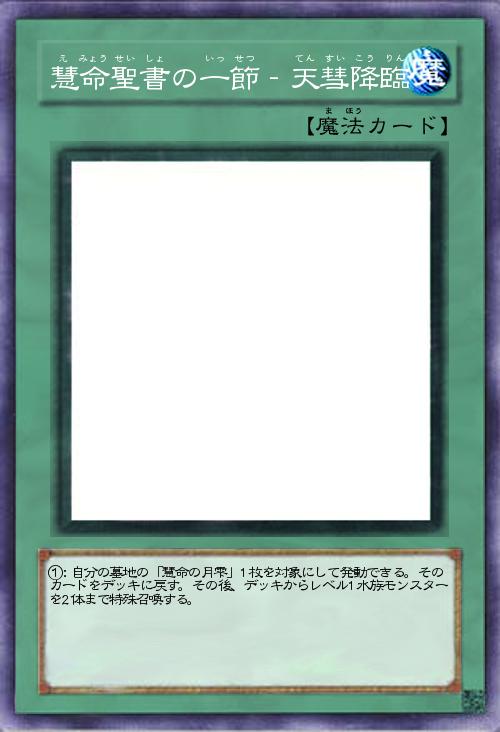 | ①:自分の墓地の「慧命の月雫」1枚を対象にして発動できる。そのカードをデッキに戻す。その後、デッキからレベル1水族モンスターを2体まで特殊召喚する。 | |||