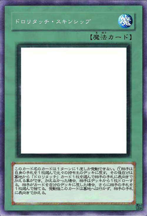 | このカード名のカードは1ターンに1度しか発動できない。①相手は自身の手札を1枚選んで元々の持ち主のデッキに戻す。その後自分は墓地から「ドロリタッチ」カード1枚を選んで相手の手札に表向きで加える事ができ、加えなかった場合、相手はデッキから1枚ドローする。相手がカードを自分のデッキに戻した場合、さらに相手の手札を1枚選んで捨てる。発動後このカードは墓地へは行かず、相手の手札に表向きで加える。 | |||