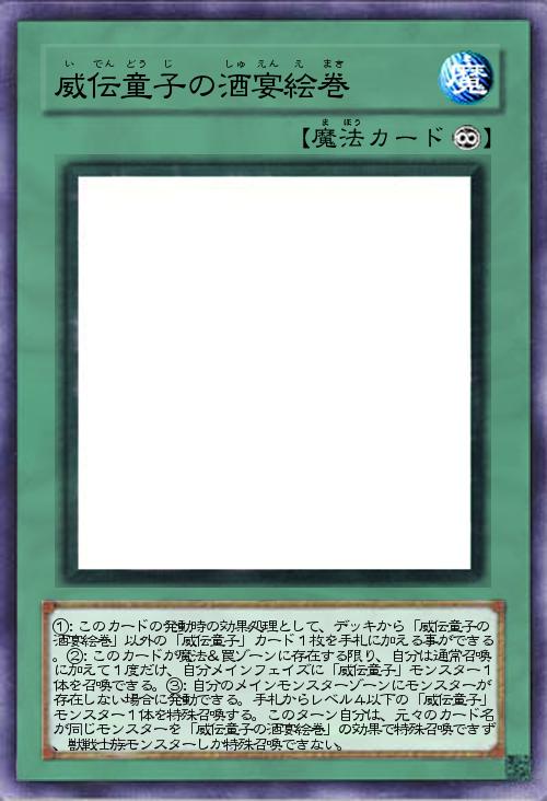 | ①:このカードの発動時の効果処理として、デッキから「威伝童子の酒宴絵巻」以外の「威伝童子」カード1枚を手札に加える事ができる。②:このカードが魔法&罠ゾーンに存在する限り、自分は通常召喚に加えて1度だけ、自分メインフェイズに「威伝童子」モンスター1体を召喚できる。③:自分のメインモンスターゾーンにモンスターが存在しない場合に発動できる。手札からレベル4以下の「威伝童子」モンスター1体を特殊召喚する。このターン自分は、元々のカード名が同じモンスターを「威伝童子の酒宴絵巻」の効果で特殊召喚できず、獣戦士族モンスターしか特殊召喚できない。 | |||