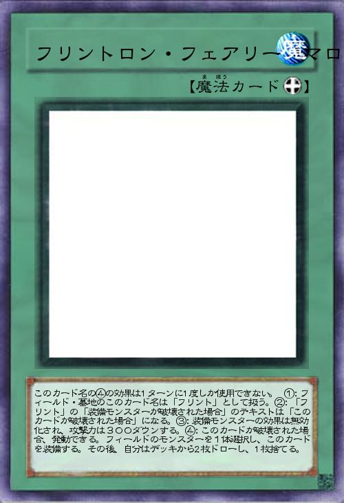 | このカード名の④の効果は1ターンに1度しか使用できない。 ①:フィールド・墓地のこのカード名は「フリント」として扱う。②:「フリント」の「装備モンスターが破壊された場合」のテキストは「このカードが破壊された場合」になる。③:装備モンスターの効果は無効化され、攻撃力は300ダウンする。④:このカードが破壊された場合、発動できる。フィールドのモンスターを1体選択し、このカードを装備する。その後、自分はデッキから2枚ドローし、1枚捨てる。 | |||