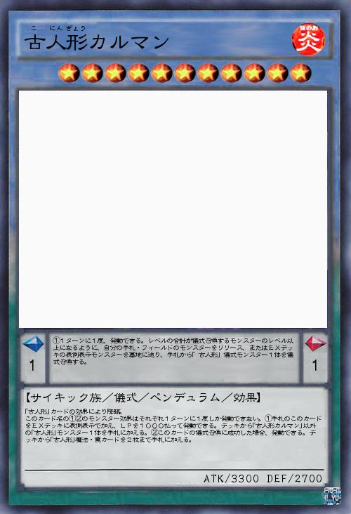 | 「古人形」カードの効果により降臨。 このカード名の①②のモンスター効果はそれぞれ1ターンに1度しか発動できない。①手札のこのカードをEXデッキに表側表示で加え、LPを1000払って発動できる。デッキから「古人形カルマン」以外の「古人形」モンスター1体を手札に加える。②このカードの儀式召喚に成功した場合、発動できる。デッキから「古人形」魔法・罠カードを2枚まで手札に加える。 | |||