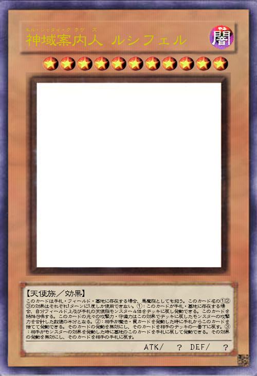 | このカードは手札・フィールド・墓地に存在する場合、悪魔族としても扱う。このカード名の①②③の効果はそれぞれ1ターンに1度しか使用できない。①:このカードが手札・墓地に存在する場合、自分フィールド上及び手札の天使族モンスター4体をデッキに戻し発動できる。このカードを特殊召喚する。このカードの元々の攻撃力・守備力はこの効果でデッキに戻したモンスターの攻撃力を合計した数値の半分となる。②:相手が魔法・罠カードを発動した時に手札からこのカードを捨てて発動できる。そのカードの発動を無効にし、そのカードを相手のデッキの一番下に戻す。③:相手がモンスターの効果を発動した時に墓地のこのカードを手札に戻して発動できる。その効果の発動を無効にし、そのカードを相手の手札に戻す。 | |||