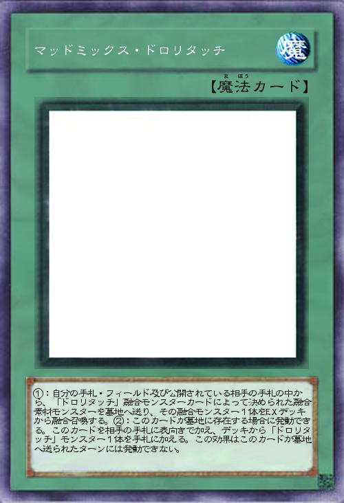 | ①:自分の手札・フィールド及び公開されている相手の手札の中か ら、「ドロリタッチ」融合モンスターカードによって決められた融合素材モンスターを墓地へ送り、その融合モンスター1体をEXデッキから融合召喚する。②:このカードが墓地に存在する場合に発動できる。このカードを相手の手札に表向きで加え、デッキから「ドロリタッチ」モンスター1体を手札に加える。この効果はこのカードが墓地へ送られたターンには発動できない。 | |||