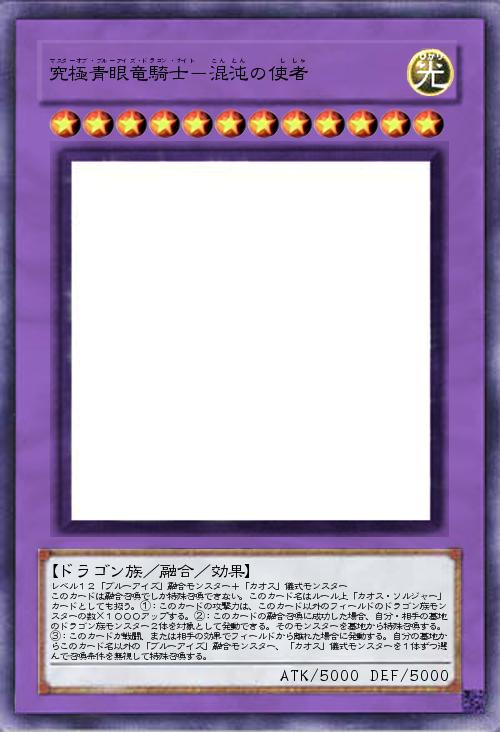 ③の効果はアニメでの融合解除による効果破壊からの防御を意識し、実際青眼の究極竜とカオス・ソルジャーを墓地から特殊召喚できる。真青眼の究極竜と超戦士カオス・ソルジャーで融合して新たな切り札で攻撃しよう!!!攻撃名は「ハイパー・カオス・ギャラクシー・クラッシャー」」(2021-09-29 21:19)