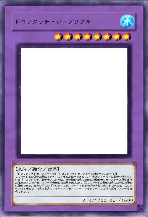 | 「ドロリタッチ」モンスター1体+「ドロリタッチ」モンスター以外のモンスター1体 このカード名の②の効果は1ターンに1度しか使用できない。①自分フィールドの融合召喚されている「ドロリタッチ」融合モンスターは、その融合召喚に使用した融合素材モンスターと属性または種族が同じ相手モンスターが発動した効果を受けない。②このカードが融合召喚に成功した場合に発動できる。自分の手札の「ドロリタッチ」カード1枚を相手の手札に表向きで加える。次のターン終了時まで、相手は自身のフィールドのモンスター1体をリリースしなければモンスターを召喚できない。 | |||