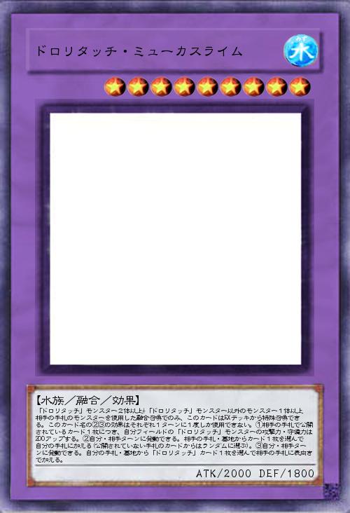 | 「ドロリタッチ」モンスター2体以上+「ドロリタッチ」モンスター以外のモンスター1体以上 相手の手札のモンスターを使用した融合召喚でのみ、このカードはEXデッキから特殊召喚でき る。このカード名の②③の効果はそれぞれ1ターンに1度しか使用できない。①相手の手札で公開されているカード1枚につき、自分フィールドの「ドロリタッチ」モンスターの攻撃力・守備力は200アップする。②自分・相手ターンに発動できる。相手の手札・墓地からカード1枚を選んで自分の手札に加える(公開されていない手札のカードからはランダムに選ぶ)。③自分・相手ターンに発動できる。自分の手札・墓地から「ドロリタッチ」カード1枚を選んで相手の手札に表向きで加える。 | |||