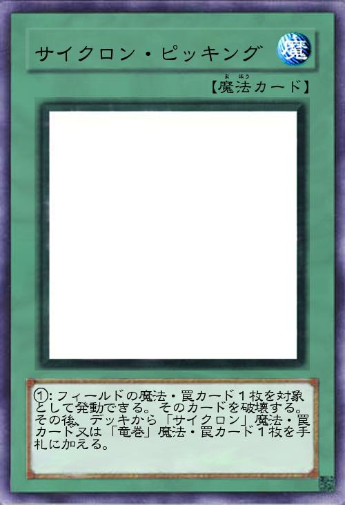 | ①:フィールドの魔法・罠カード1枚を対象として発動できる。そのカードを破壊する。その後、デッキから「サイクロン」魔法・罠カード又は「竜巻」魔法・罠カード1枚を手札に加える。 | |||