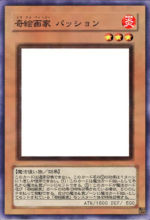 | このカードは通常召喚できない。このカード名の②の効果は1ターンに1度しか使用できない。①:このカードは魔法カード扱いとして手札から魔法&罠ゾーンにセットできる。②:このカードが魔法カード及び「奇絵画家」カードの効果で特殊召喚されている場合、500LPを払って発動できる。自分の魔法&罠ゾーンに魔法カード扱いとしてセットされている「奇絵画家」モンスター1体を特殊召喚する。 | |||