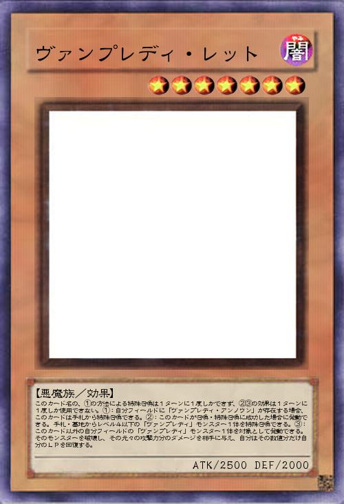 「新しいオリジナルカテゴリ「ヴァンプレディ」 このカテゴリはバーン&回復をしてくデッキ。切り札は儀式にする このカードは自分フィールドに「ヴァンプレディ・アンノウン」(後日出す)がいると手札から特殊召喚できて召喚・特殊召喚で手札か墓地から下級「ヴァンプレディ」を出す効果と「ヴァンプレディ」を破壊して元々の攻撃力バーンと回復」(2021-10-03 09:11)