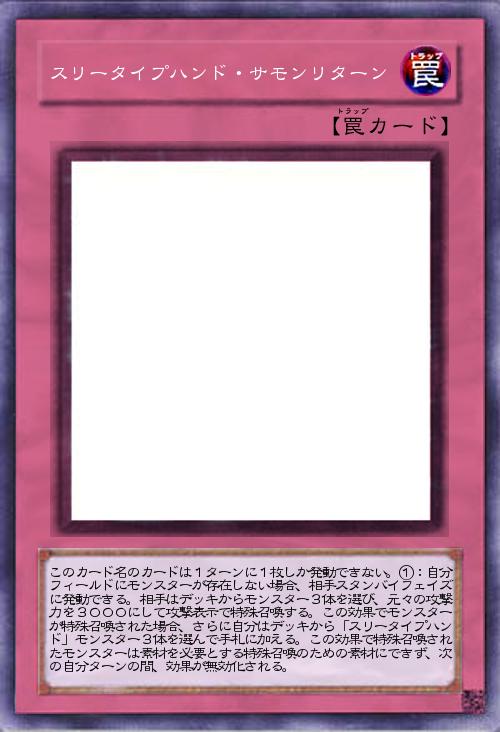 | このカード名のカードは1ターンに1枚しか発動できない。①:自分フィールドにモンスターが存在しない場合、相手スタンバイフェイズに発動できる。相手はデッキからモンスター3体を選び、元々の攻撃力を3000にして攻撃表示で特殊召喚する。この効果でモンスターが特殊召喚された場合、さらに自分はデッキから「スリータイプハンド」モンスター3体を選んで手札に加える。この効果で特殊召喚されたモンスターは素材を必要とする特殊召喚のための素材にできず、次の自分ターンの間、効果が無効化される。 | |||