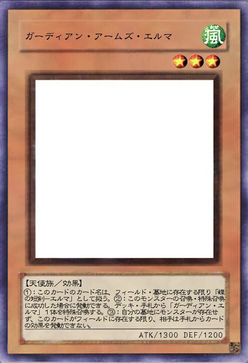 | ①:このカードのカード名は、フィールド・墓地に存在する限り「蝶の短剣-エルマ」として扱う。②:このモンスターの召喚・特殊召喚に成功した場合に発動できる。デッキ・手札から「ガーディアン・エルマ」1体を特殊召喚する。③:自分の墓地にモンスターが存在せ ず、このカードがフィールドに存在する限り、相手は手札からカードの効果を発動できない。 | |||