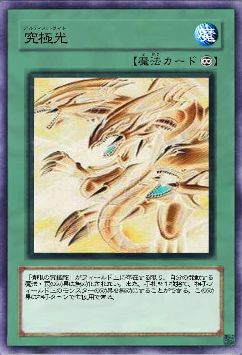 | 「青眼の究極龍」がフィールド上に存在する限り、自分の発動する魔法・罠の効果は無効化されない。また、手札を1枚捨て、相手フィールド上のモンスターの効果を無効にすることができる。この効果は相手ターンでも使用できる。 | |||