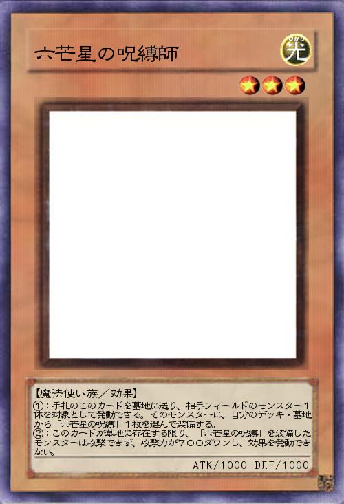 | ①:手札のこのカードを墓地に送り、相手フィールドのモンスター1体を対象として発動できる。そのモンスターに、自分のデッキ・墓地から「六芒星の呪縛」1枚を選んで装備する。 ②:このカードが墓地に存在する限り、「六芒星の呪縛」を装備したモンスターは攻撃できず、攻撃力が700ダウンし、効果を発動できない。 | |||