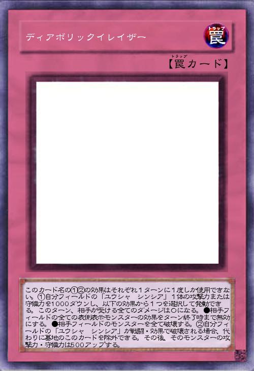 | このカード名の①②の効果はそれぞれ1ターンに1度しか使用できない。①自分フィールドの「ユウシャ シンシア」1体の攻撃力または守備力を1000ダウンし、以下の効果から1つを選択して発動でき る。このターン、相手が受ける全てのダメージは0になる。●相手フィールドの全ての表側表示モンスターの効果をターン終了時まで無効にする。●相手フィールドのモンスターを全て破壊する。②自分フィールドの「ユウシャ シンシア」が戦闘・効果で破壊される場合、代わりに墓地のこのカードを除外できる。その後、そのモンスターの攻撃力・守備力は500アップする。 | |||