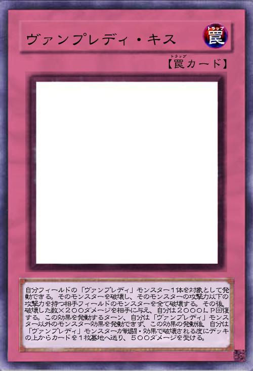 「「ヴァンプレディ」を破壊してその攻撃力以下の相手モンスター全破壊してその数×200バーン&2000回復 回復値が多い代わりにこのカードを発動するターン「ヴァンプレディ」以外のモンスター効果を発動できず、発動後、「ヴァンプレディ」が戦闘・効果で破壊されると自分がデッキの上1枚墓地500バーン 制約は重めにしたから多分バランスは取れてると思う」(2021-10-09 00:11)