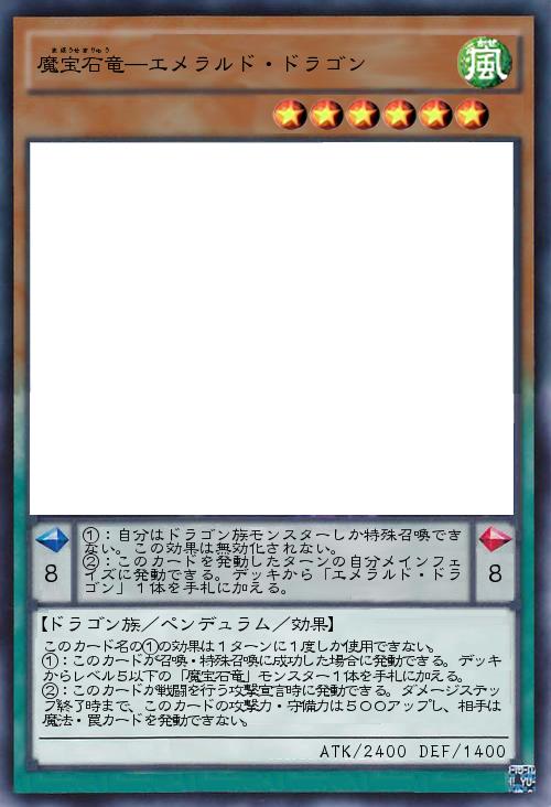| ①:自分はドラゴン族モンスターしか特殊召喚できない。この効果は無効化されない。 ②:このカードを発動したターンの自分メインフェイズに発動できる。デッキから「エメラルド・ドラゴン」1体を手札に加える。 | |||