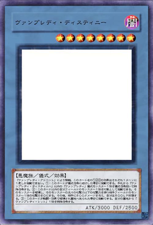 | 「ヴァンプレディ・アドベント」により降臨。このカード名の①②③の効果はそれぞれ1ターンに1度しか発動できない。①:このカードが儀式召喚に成功した場合に発動できる。手札から「ヴァンプレディ・ディスティニー」以外の「ヴァンプレディ」儀式モンスター1体を儀式召喚扱いで特殊召喚する。②:このカード以外の自分フィールドのモンスター1体を対象として発動できる。そのモンスターを破壊し、そのモンスターの元々の攻撃力以下の攻撃力を持つ相手フィールドのモンスター1体の攻撃力を0にする。その後、相手に500ダメージを与え、自分は500LP回復する。③:このカードが戦闘・効果で破壊され墓地へ送られた場合に発動できる。自分の墓地から「ヴァンプレディ・レット」1体を特殊召喚する。 | |||