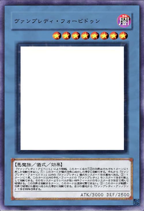 | 「ヴァンプレディ・アドベント」により降臨。このカード名の①③の効果はそれぞれ1ターンに1度しか発動できない。①:このカードが儀式召喚に成功した場合に発動できる。手札から「ヴァンプレディ・フォービドゥン」以外の「ヴァンプレディ」儀式モンスター1体を墓地へ送る。②:1ターンに1度、このカード以外の手札・フィールドの「ヴァンプレディ」モンスター1体を対象として発動できる。そのモンスターよりレベルが低い相手フィールドのモンスターを3体まで選んで破壊する。この効果を発動するターン、このカードは直接攻撃できない。③:このカードが戦闘・効果で破壊され墓地へ送られた場合に発動できる。自分の墓地から「ヴァンプレディ・アンノウン」1体を特殊召喚する。 | |||