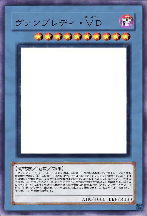 | 「ヴァンプレディ・アドベント」により降臨。このカード名のの効果はそれぞれ1ターンに1度しか発動できない。①:このカード以外の自分フィールドの「ヴァンプレディ」儀式モンスター1体を破壊して発動できる。このカードの攻撃力はそのモンスターのレベル×200アップし、相手にそのモンスターのレベル×100ダメージを与え、自分はその数値分だけLPを回復する。②:このカードが相手によって破壊され墓地へ送られた場合に自分の墓地の「ヴァンプレディ・∀D」以外の「ヴァンプレディ」儀式モンスター2体を対象として発動できる(同名カードは1枚まで)。そのモンスターを特殊召喚する。 | |||