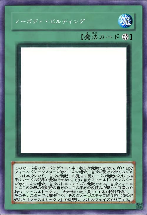 | このカード名のカードはデュエル中1枚しか発動できない。①:自分フィールドにモンスターが存在しない場合、自分が受ける全てのダメージは半分になり、自分が発動した魔法・罠カードの発動に対して相手はカードの効果を発動できない。②:自分フィールドにモンスターが存在しない場合、自分バトルフェイズに発動できる。自分フィールドにこの効果の発動時の自分のLPの半分の数値の攻撃力・守備力を持つ「マッスルトークン」(戦士族・地・星1)1体を特殊召喚し、そのモンスターで攻撃を行う。そのダメージステップ終了時、特殊召喚した「マッスルトークン」を破壊し、バトルフェイズを終了する。 | |||