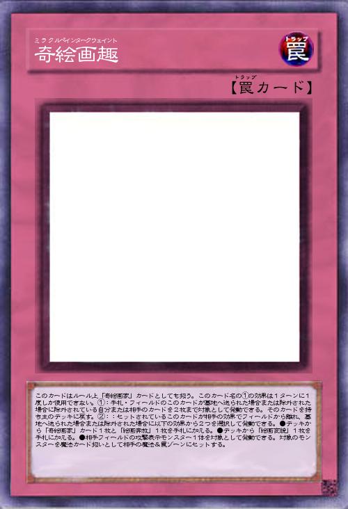 | このカードはルール上「奇絵画家」カードとしても扱う。このカード名の①の効果は1ターンに1度しか使用できない。①:手札・フィールドのこのカードが墓地へ送られた場合または除外された場合に除外されている自分または相手のカードを2枚まで対象として発動できる。そのカードを持ち主のデッキに戻す。②::セットされているこのカードが相手の効果でフィールドから離れ、墓地へ送られた場合または除外された場合に以下の効果から2つを選択して発動できる。●デッキから「奇絵画家」カード1枚と「絵画奔放」1枚を手札に加える。●デッキから「絵画変貌」1枚を手札に加える。●相手フィールドの攻撃表示モンスター1体を対象として発動できる。対象のモンスターを魔法カード扱いとして相手の魔法&罠ゾーンにセットする。 | |||