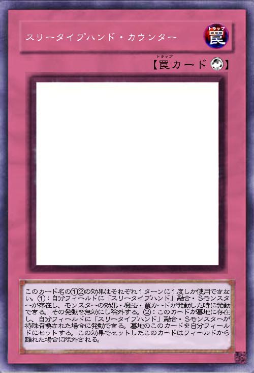 | このカード名の①②の効果はそれぞれ1ターンに1度しか使用できない。①:自分フィールドに「スリータイプハンド」融合・Sモンスターが存在し、モンスターの効果・魔法・罠カードが発動した時に発動できる。その発動を無効にし除外する。②:このカードが墓地に存在し、自分フィールドに「スリータイプハンド」融合・Sモンスターが特殊召喚された場合に発動できる。墓地のこのカードを自分フィールドにセットする。この効果でセットしたこのカードはフィールドから離れた場合に除外される。 | |||