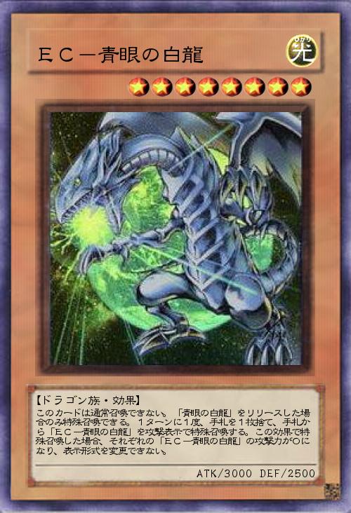 | このカードは通常召喚できない。「青眼の白龍」をリリースした場合のみ特殊召喚できる。1ターンに1度、手札を1枚捨て、手札から「EC-青眼の白龍」を攻撃表示で特殊召喚する。この効果で特殊召喚した場合、それぞれの「EC-青眼の白龍」の攻撃力が0になり、表示形式を変更できない。 | |||