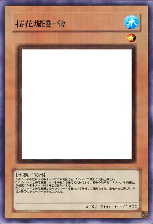 | このカードの効果は相手ターンにのみ発動でき、1ターンに1度しか発動出来ない。 ①このカードと桜花爛漫カードを手札から捨てて発動できる。相手の効果モンスター、永続魔法、永続罠の効果をターン終了時まで無効にする。 ②このカードと桜花爛漫と名のつくカードを墓地から除外して発動できる。墓地から攻撃力0、守備力1800のチューナーを手札に加える。 | |||
