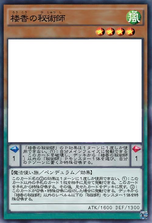 | 「楼香の秘術師」のP効果は1ターンに1度しか使用できない。①:自分メインフェイズに発動できる。このカードを破壊し、デッキから「楼香の秘術師」以外の「秘術師」Pモンスター1体を選び、自分のPゾーンに置くか特殊召喚する。 | |||