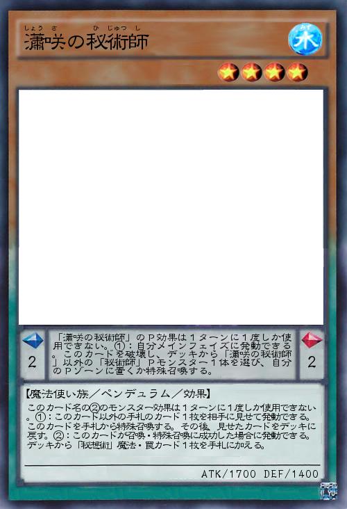 | 「瀟咲の秘術師」のP効果は1ターンに1度しか使用できない。①:自分メインフェイズに発動できる。このカードを破壊し、デッキから「瀟咲の秘術師」以外の「秘術師」Pモンスター1体を選び、自分のPゾーンに置くか特殊召喚する。 | |||