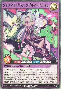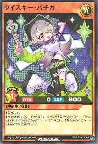 【条件】自分のデッキのカードが10枚以上で、自分フィールドに表側表示の「ダイスキー・バチカ」がいる場合、デッキをシャッフルして発動できる。 【効果】自分のデッキの一番上のカードを墓地へ送る。この効果でサイコロを振る効果を持つモンスター(レベル7)が墓地へ送られた場合、さらに相手に700ダメージを与える。ダメージを与えた場合、さらに自分または相手フィールドのカードを合計7枚まで選んで破壊できる。 |