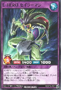 「E・HEROバブルマン」+「E・HEROフェザーマン」 このカードはフュージョン召喚でしか特殊召喚できない。【条件】自分の魔法&罠ゾーンに裏側表示のカードがある場合、デッキの一番上のカードを墓地へ送って発動できる。 【効果】このターン、このカードは直接攻撃できる。 |
