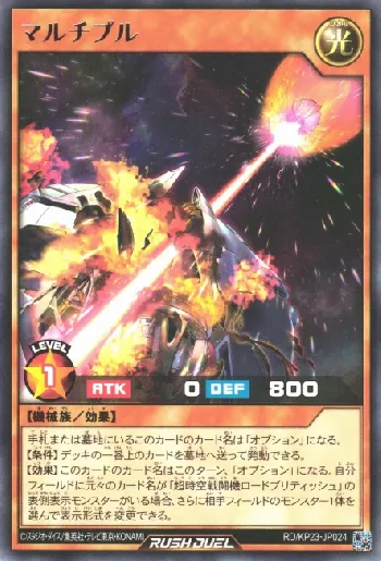 | 手札または墓地にいるこのカードのカード名は「オプション」になる。【条件】デッキの一番上のカードを墓地へ送って発動できる。 【効果】このカードのカード名はこのターン、「オプション」になる。自分フィールドに元々のカード名が「超時空戦闘機ロードブリティッシュ」の表側表示モンスターがいる場合、さらに相手フィールドのモンスター1体を選んで表示形式を変更できる。 |
