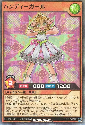 | 【条件】このカードを召喚・特殊召喚した自分メインフェイズに、手札1枚をデッキの下に戻して発動できる。 【効果】自分の墓地の「ハンディーレディ」1体を選んで手札に加える。自分フィールドに表側表示のフュージョンモンスター(レベル8)がいない場合、さらに自分の手札・フィールドの元々の守備力が1200のモンスター(風属性)2体を素材として墓地へ送ってフュージョン召喚できる。 |
