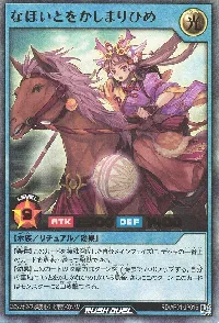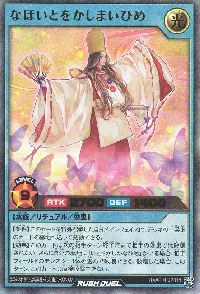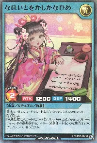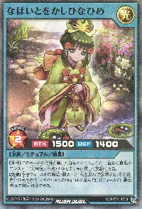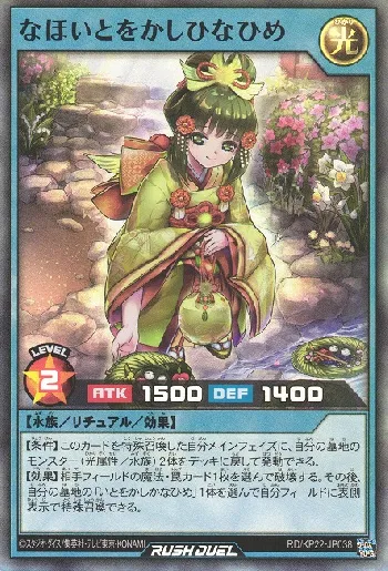 | 墓地にいるこのカードのカード名は「いとをかしかなひめ」になる。【条件】なし【永続効果】このカードのカード名は「いとをかしかなひめ」になる。自分フィールドの表側表示モンスター(光属性/水族)の攻撃力は500アップし、レベルは5上がる。 | ||||||