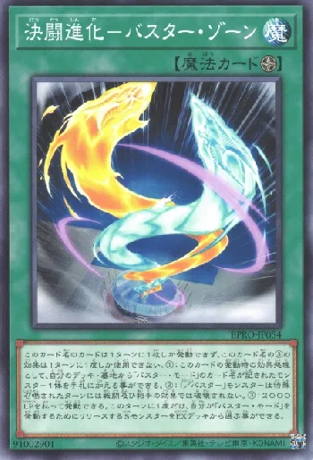 | このカード名のカードは1ターンに1枚しか発動できず、このカード名の(3)の効果は1ターンに1度しか使用できない。 (1):このカードの発動時の効果処理として、自分のデッキ・墓地から「バスター・モード」のカード名が記されたモンスター1体を手札に加える事ができる。 (2):「/バスター」モンスターは特殊召喚されたターンには戦闘及び相手の効果では破壊されない。 (3):2000LPを払って発動できる。このターンに1度だけ、自分が「バスター・モード」を発動するためにリリースするSモンスターをEXデッキから選ぶ事ができる。 |