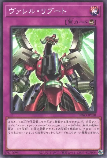 | このカードはLPを半分払って手札から発動する事もできる。 (1):自分フィールドに「ヴァレット」モンスターか「ヴァレル」モンスターが存在し、相手が魔法・罠カードを発動した時に発動できる。その発動を無効にし、そのカードをそのままセットする。この効果でセットしたカードはこのターン発動できない。 |